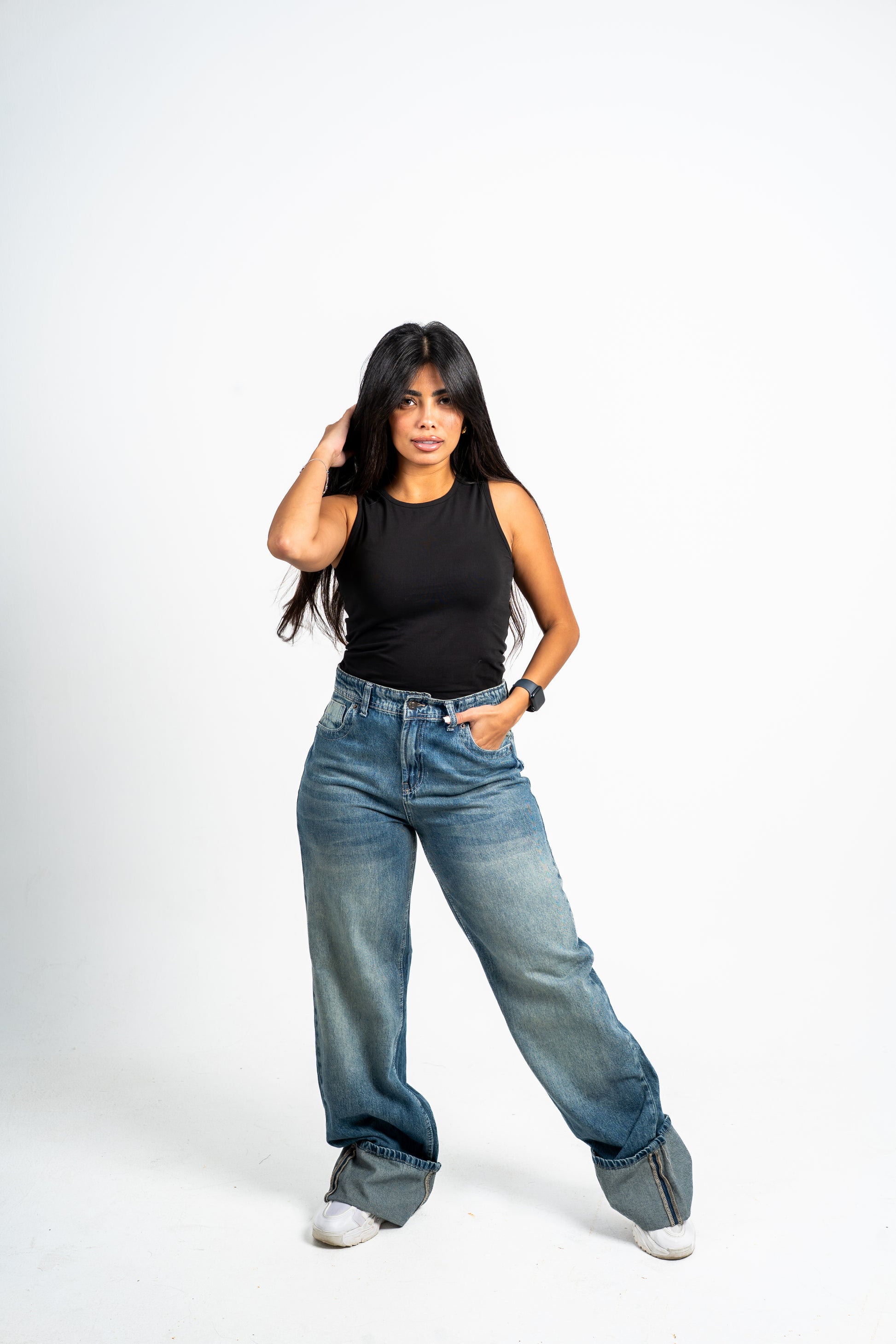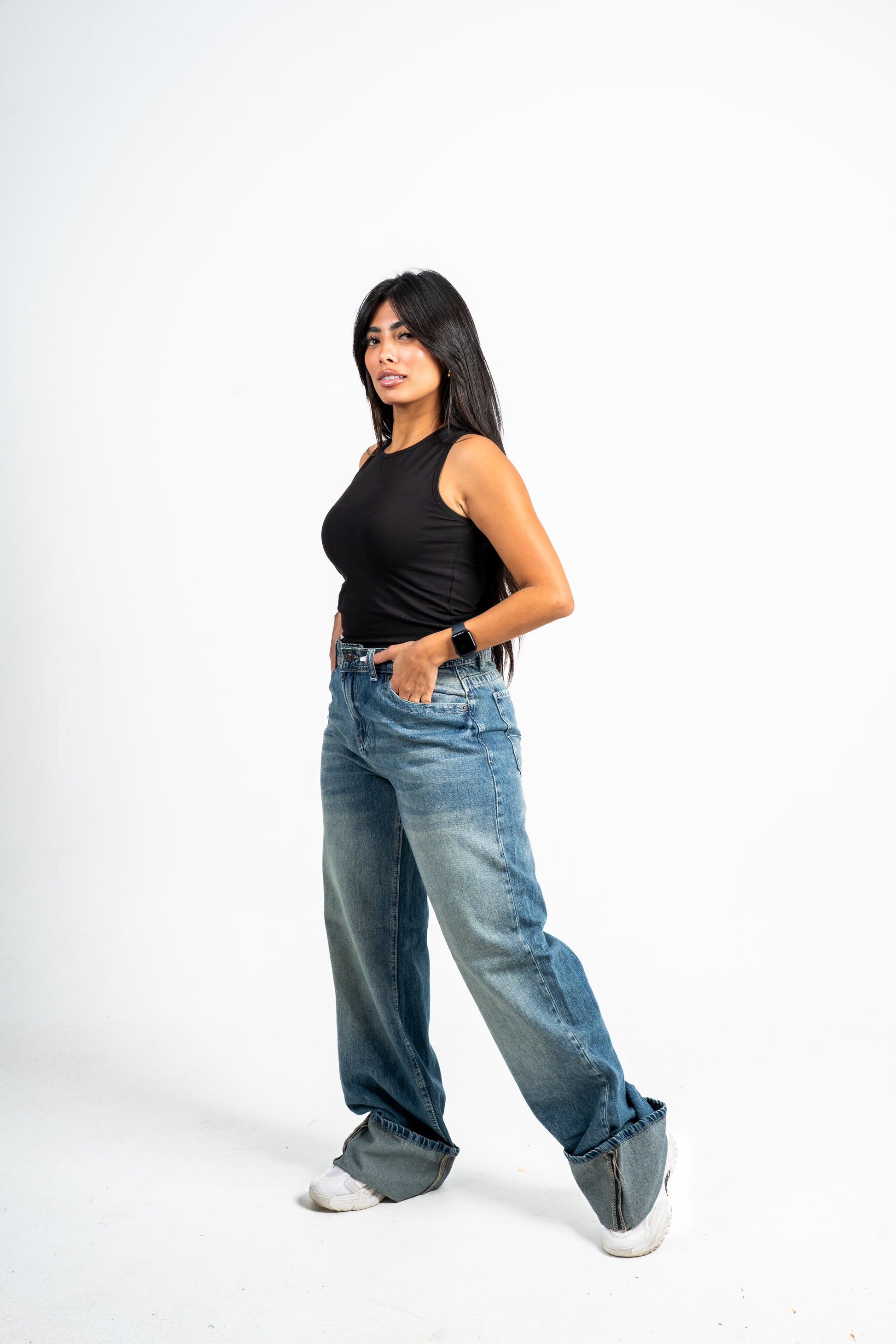 Cuffed wide leg jeans mid blue washed